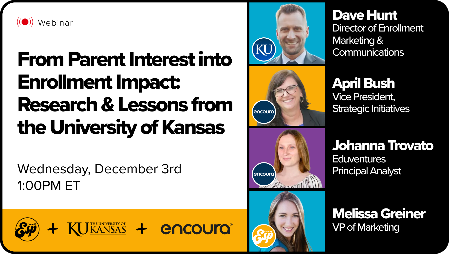Families aren’t just along for the ride — they’re often the deciding factor in where students apply, enroll, and persist. Join CampusESP, Encoura, and the University of Kansas for an inside look at new research on how families shape the enrollment journey, paired with a real-world example of family engagement in action.